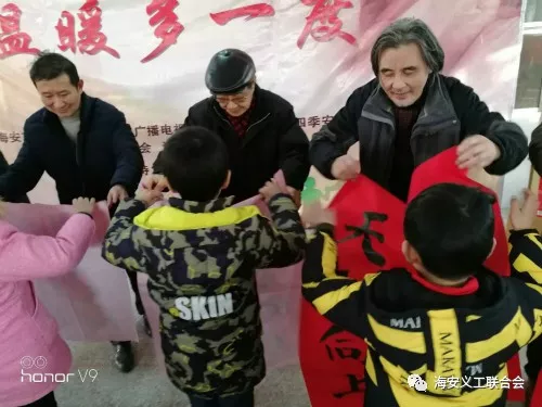 礼物可真不少,孩子们都拎不动了。别急,接下来还有精神大餐呢!艺术家们将自己的墨宝也送给了这些孩子,看看,今年过年大门上贴的对联可都是大师之作,拿钱都买不到哦!