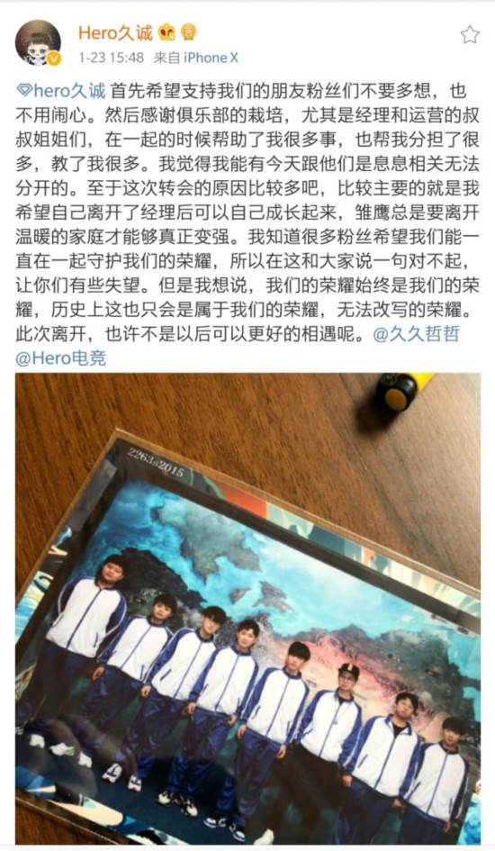 腾讯体育新闻1月23日讯 转会期选手的挂牌消息一直饱受粉丝们的关注,今日Hero久竞宣布三届FMVP曹志顺(ID:久诚)确认挂牌,久诚也发微博也表示希望自己可以有更多的进步。