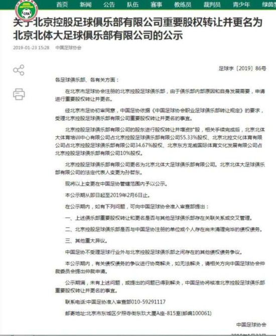 腾讯体育1月23日 足协官方公示,北京北体大占北京控股足球俱乐部有限公司55.33%股权,北京控股足球俱乐部有限公司更名为北京北体大足球俱乐部有限公司。