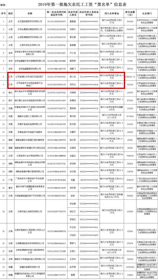 据人力资源社会保障部网站消息,为进一步加大对拖欠工资违法行为打击力度,人力资源社会保障部向国家发展改革委推送2019年第一批拖欠农民工工资“黑名单”信息。该批黑名单共涉及30户用人单位及其相关责任人。这些用人单位在用工过程中均存在严重拖欠农民工工资违法行为。
