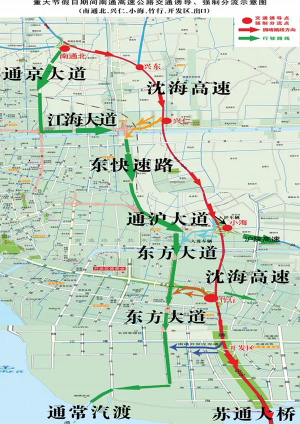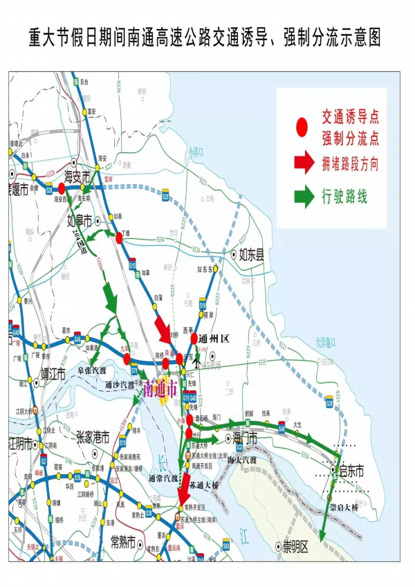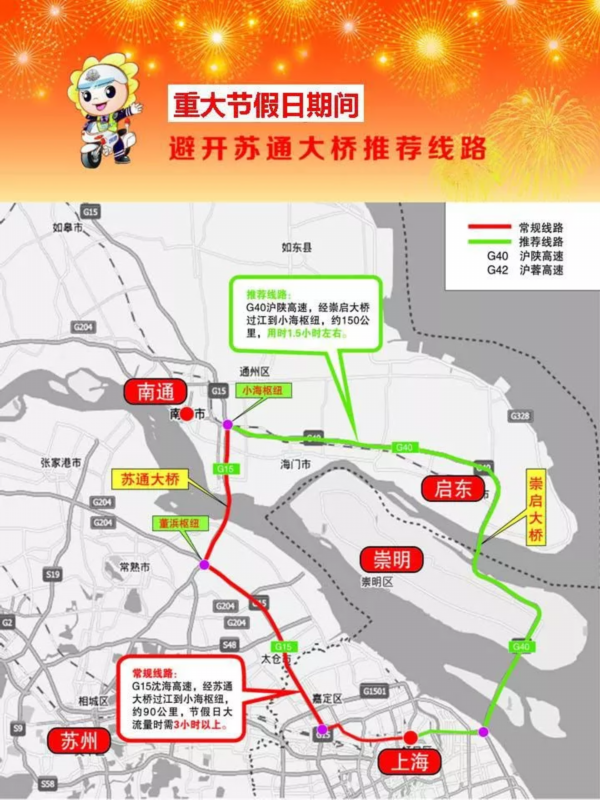 重大节假日期间,当苏通大桥由北往南方向车流量大、拥堵时,建议避开苏通大桥,入苏车辆可由通常、通沙汽渡、海太汽渡(过江);入沪车辆可由G40沪陕→崇启大桥(过江)→上海。
