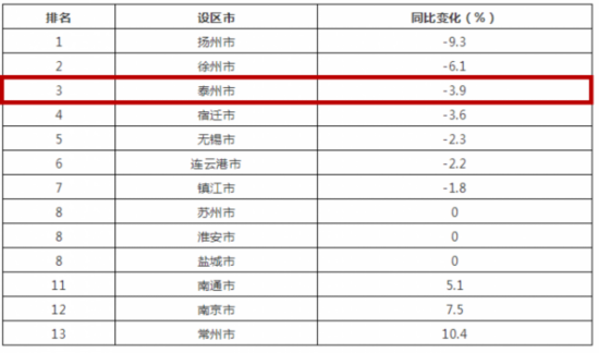 2018年江苏省13个设区市PM2.5浓度变化幅度排名