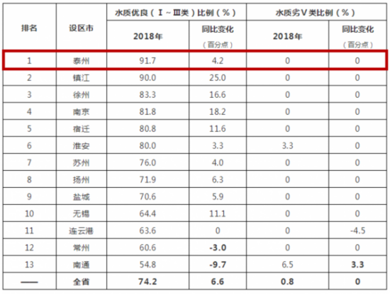 2018年,全省地表水环境同比有所改善,国考断面水质优Ⅲ、劣Ⅴ比例分别为68.3%、1.0%,均达国家年度考核目标。