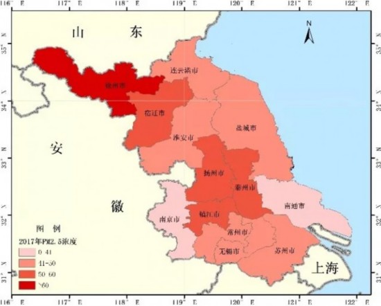 2017年(左)、2018年(右)江苏省PM2.5年均浓度分布