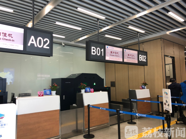南京禄口国际机场南京南站城市候机楼位于高铁南京南站一楼南京长途汽车客运南站旁。进入候机楼后,可以在售票处购买机场大巴车票,只需要再走三四米,就能够来到值机柜台,记者看到,旅客基本上无需排队,即到即办,三四分钟就能够办理完成值机和行李托运。值机柜台的前方就是安检机和候车区,通过安检门后,旅客就可以在候车区等候机场大巴,整个流程也只需要五分钟。