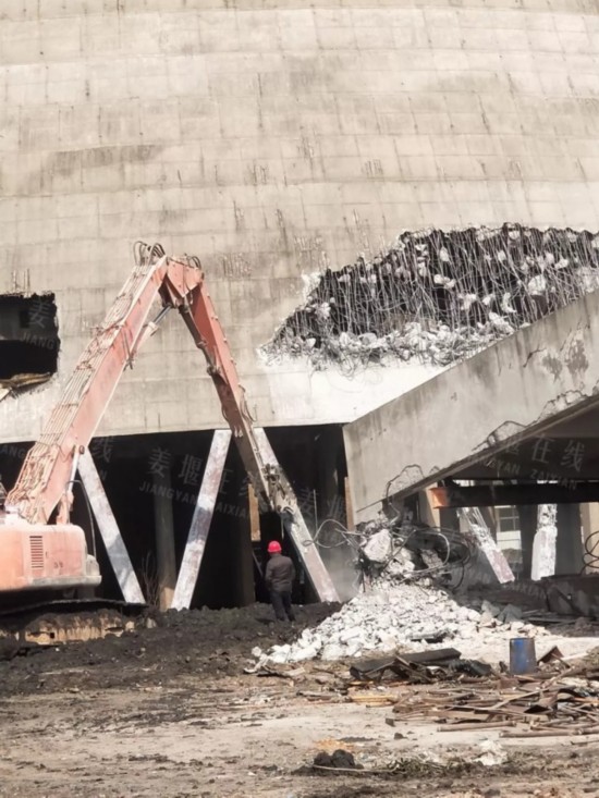 据江苏省工业设备安装集团有限公司建筑工程分公司工作人员介绍,这座冷却塔高75米,顶部直径约50米,底部直径六七十米。昨天上午9点18分,机械定向拆除工作正式启动。中午12点48分,冷却塔被拆除倒下。