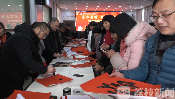 据了解,在短短的两个小时活动中,书法名家们现场书写了近千副春联和福字。