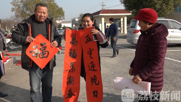 在布置好的会议室里,挤满了前来领春联的村民,他们围站在书法名家们的旁边,等待为自己书写春联和福字。东台市书法家协会主席吴健华告诉记者,东台是全国首批命名的书画艺术之乡,有着丰富的文化底蕴,他们今天邀请了东台十八位书法名家来到美丽的头灶镇,就是在新时代精神的感召下,给这里的村民写春联送祝福,希望大家在新的一年里红红火火,开开心心。在活动现场,不少村民将刚拿到的春联晾晒在台阶上,等墨迹干了再带回家中,两个小朋友看到记者在拍摄,还站到一起向记者展示手中的福字。刚刚拿到四副春联的村民钱权山告诉记者,听说今天有书法家来写春联,他特地从二十多里外的乡下赶过来,就是讨要一副墨宝。
