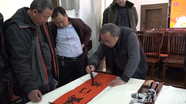 1月23日下午,来自东台市书法家协会的十八名书法名家,集体来到东台市头灶镇,现场挥毫泼墨,为村民们书写春联送祝福,受到村民的热烈欢迎,争相前来讨要墨宝。