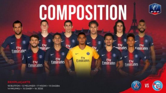 腾讯体育讯 北京时间1月24日凌晨4时05分,2018-19赛季法国杯1/16决赛,巴黎圣日耳曼坐镇王子公园球场迎战斯特拉斯堡。赛前双方首发及替补名单公布。