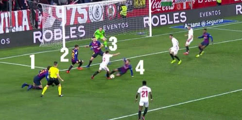 两丢球,巴萨都犯下致命错误。首球是主队中卫前压至中圈附近连续横传,居然调动皮克换防到右路,来盯快马普罗梅斯,被对手从外线超车轻松抹过送传中,客队防线位置大乱,客串左后卫的塞梅多被迫内收中路协防,凌空断球未果,后点的萨拉维亚已无人防守。