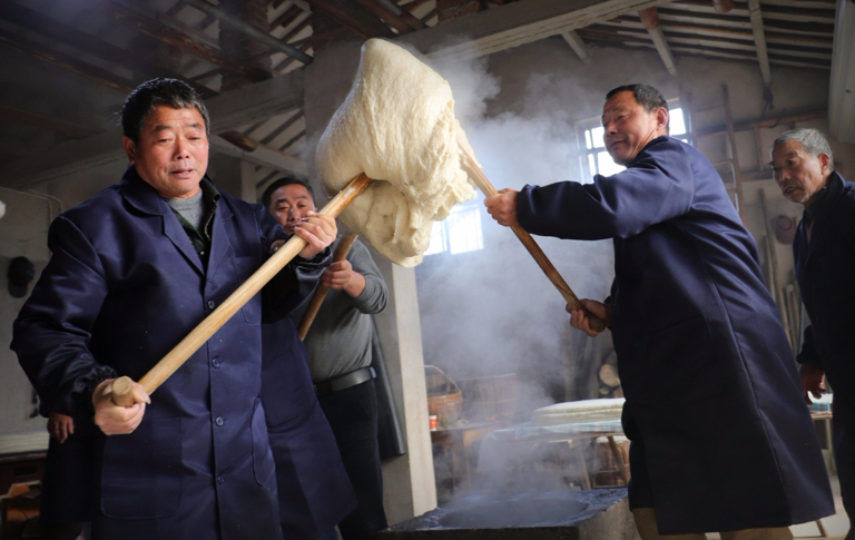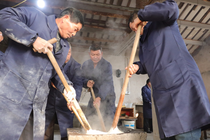 “不打糍粑不过年,打了几十年了,老传统!”刘国富告诉记者:“打糍粑和打铁似的,必须趁热,直至糯米被锤打得没了米形,全部粘成一团才算是大功告成。”