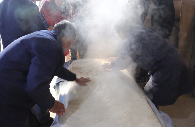 对于句容天王镇唐陵村村民刘国富来说,这两天家里比过年还热闹。每年春节前的这段时间,刘国富都会约上亲戚朋友一起来家里打糍粑。21日,当记者一来到老刘家,一股浓浓的糍粑香扑面而来,大伙们正拿着木锤打糍粑,伴随着舂臼“嗵,嗵”声,热气腾腾地把一年的丰收和喜悦都融进了打糍粑的乐趣中。刘国富告诉记者:“早上4点多钟就起床开始忙活起来了,今天一天要打4000斤糯米。”