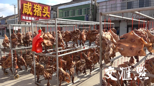 随着新春脚步的款款走近,在盐阜地区,民众有灌制香肠、腌制腊肉、腊鱼、腊鸡的习俗。在以腌制咸猪头而闻名的盐城经济开发区步凤镇小街上,更是一派繁荣的景象,满眼望去,街道两侧挂满了腌制好的咸猪头,到处飘溢着咸猪头的香味,成为一道喜迎新年独特的风景线。陈冬平 摄 视觉江苏网供图
