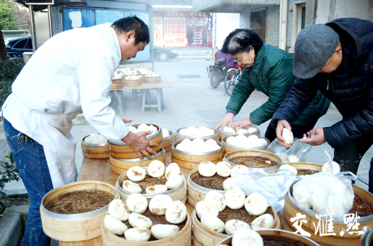 春节临近,家家户户忙过年。2019年1月22日,扬州老城区为居民代加工包子的面食店生意兴隆,周边市民排队忙“年蒸”。刚出笼的包子热气腾腾、香味飘散,浓浓的“年味”扑面而来。 沈扬生 摄 视觉江苏网供图