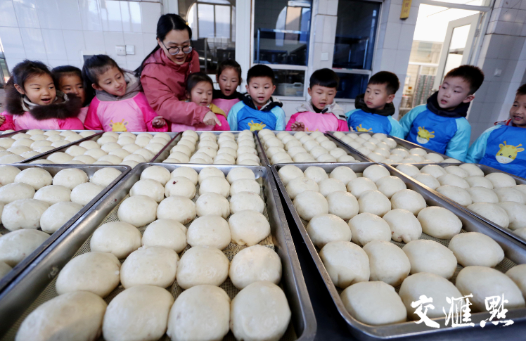 2019年1月23日,东海县幼儿园开展“感受传统文化 体验浓浓年味”活动,组织幼儿走进校园食堂,零距离学习传统美食的制作过程,感知家乡过年的风俗年味。张开虎 摄 视觉江苏网供图