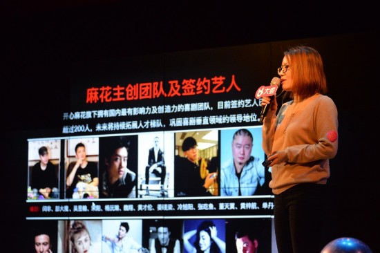 图为北京开心麻花演艺经纪有限公司总经理靳兰作为客户代表登台分享