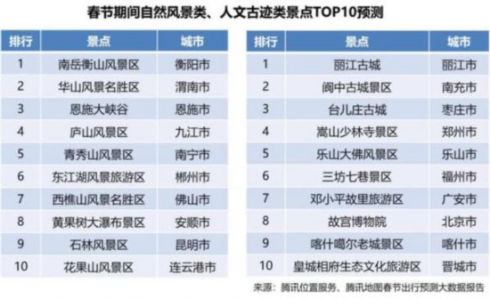 除了返乡外,春节同样是外出旅游的好时机。据《报告》预测,在全国259家5A级旅游景点中,南岳衡山风景区、华山风景名胜区、恩施大峡谷将排名最火爆自然风景类景区前三,丽江古城、阆中古城景区、台儿庄古城则是最具人气的人文古迹类景区前三。