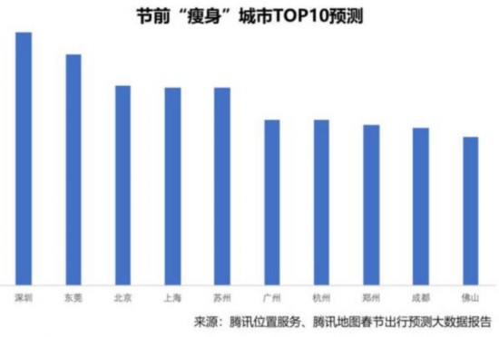《报告》首次用“瘦身”这一概念来描述某个城市在春节前期的人员净流出状况,也就是用该城市的迁出数据减去迁入数据,从而得出“瘦身”指数。10大最“瘦身”城市中,深圳、东莞、北京荣膺前三甲,再次成为“空城”,而苏州超过广州、杭州,排名第五,令人意外,看来苏州的吸引力已不亚于北上广深杭。