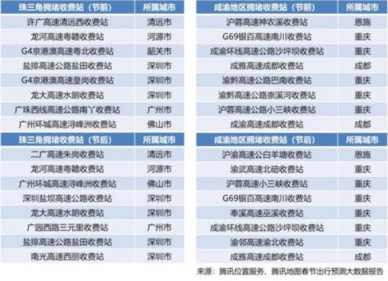 在珠三角地区,拥堵收费站全部位于广东省内,集中分布在广州、深圳等中心城市周边,及通往湖南、江西的省界区域,拥堵时间与长三角相同。长深高速东江大桥至泰美服务区、莞佛高速坦尾立交至虎门大桥,预计将成为节前、节后最拥堵的高速路段。