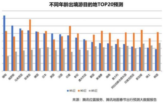 根据年龄划分,18岁以下青少年最喜欢前往东南亚国家,而60岁以上老年人最青睐的是欧美发达国家。进一步研究发现,85后最爱去的国家是韩国、新加坡、瑞士、阿联酋、越南,涵盖东亚、东南亚和欧洲,90后最爱去的国家是菲律宾、印度、新加坡、马来西亚、柬埔寨,全部在东南亚地区,95后最爱去的国家是缅甸、俄罗斯、马来西亚、菲律宾、德国,涵盖东南亚和欧洲。