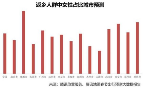 在社交平台上,曾有网友争论,在外地上学、工作的人群中,男性究竟比女性多多少?如今,《报告》给出明确的答案:从全国范围来看,春节返乡人群男女比例大概为6:4,也就是说,男性比女性高出50%左右。另据统计,女性占比最高的城市包括成都、重庆、西安等,均超过四成。
