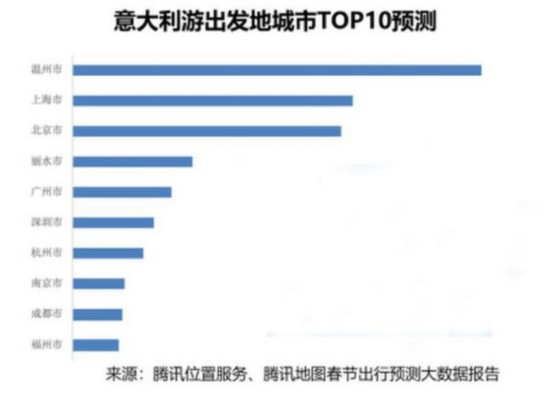 美国是唯一的不在中国“身边”的出境游目的地,出发地TOP5分别是北京、上海、广州、深圳和成都。值得注意的是,前往意大利的热门出发地城市中,温州、丽水等非一线城市跻身榜单,看来“浙商闯天下”名不虚传。