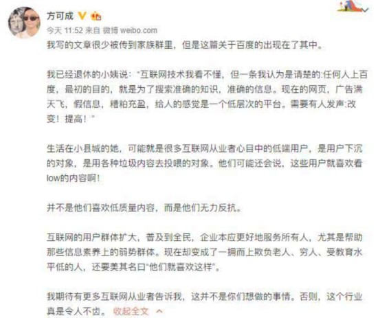 腾讯科技讯 《搜索引擎百度已死》一文作者方可成再次在微博发文称,生活在小县城的用户并不是他们喜欢低质量内容,而是他们无力反抗。此外,方可成还呼吁互联网从业者发声,帮助那些信息素养上的弱势群体。