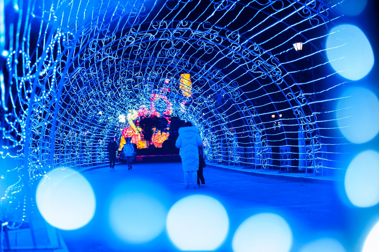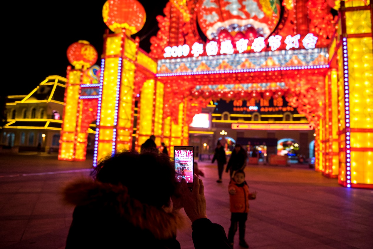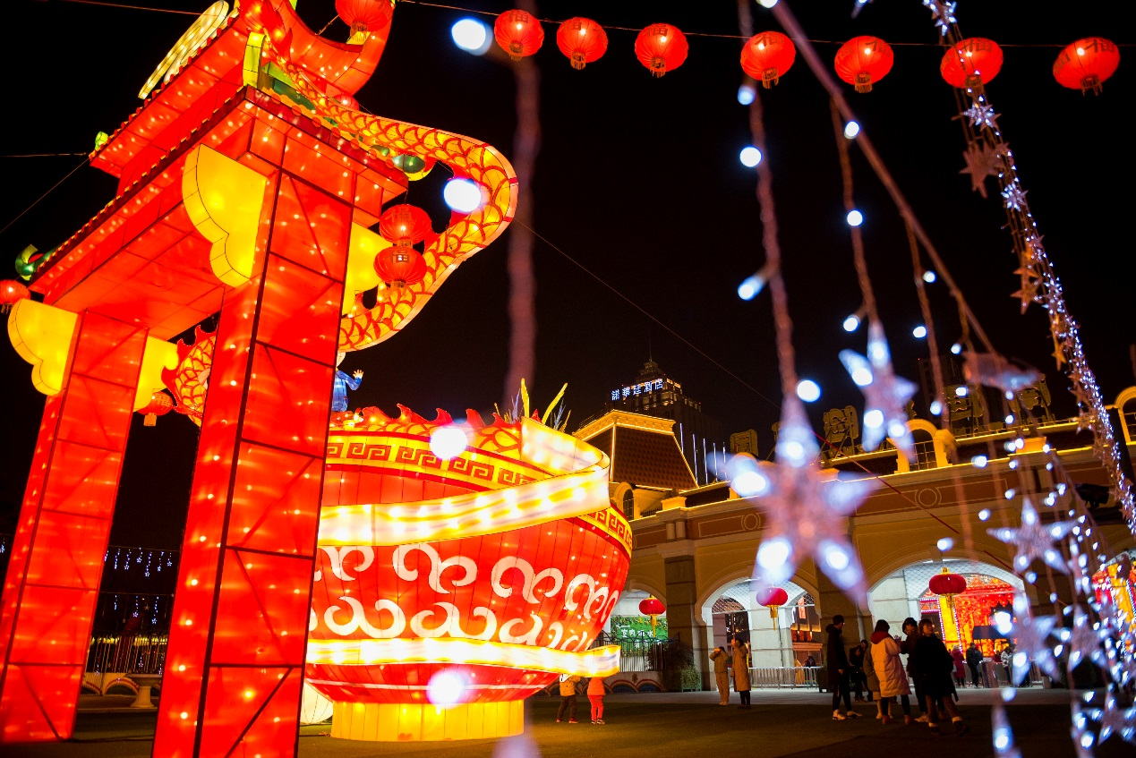 2019年1月18日,南通,探险王国举办的2019南通市新春灯会亮灯。灯会分为“欢欢喜喜过大年”“快快乐乐看热闹”“热热闹闹看南通”和“惊险刺激大探险”四大主题版块,所有灯组造型宏伟壮观,色彩绚丽,集观赏性、互动性、娱乐性于一体,传承千年的中华技艺与高科技光影技术相结合,灯会日期为1月18日至2月24日。