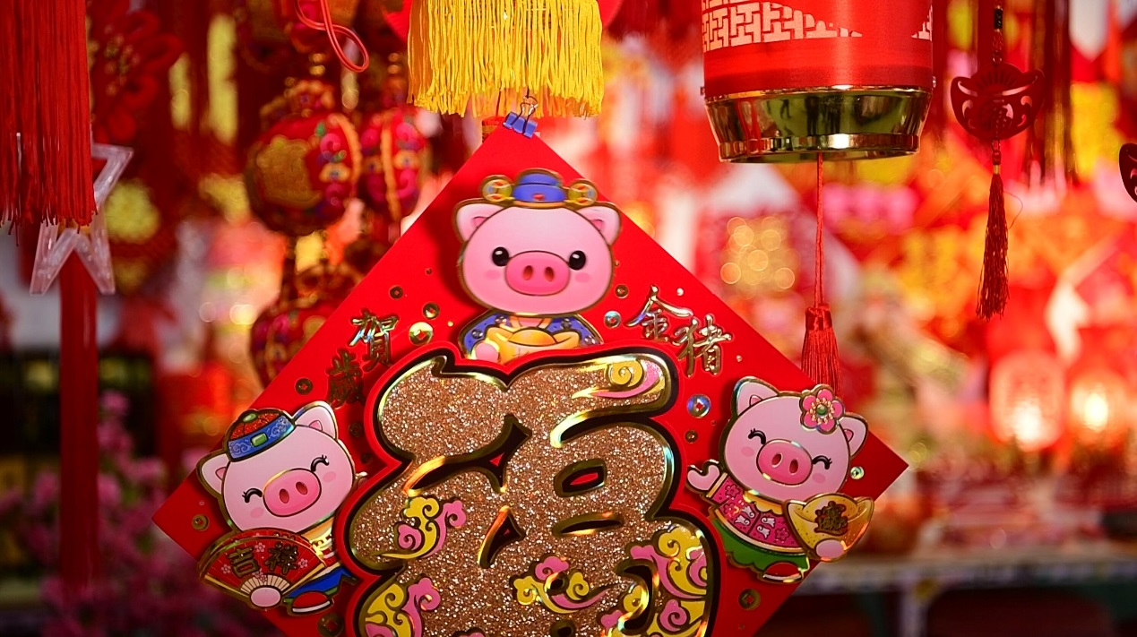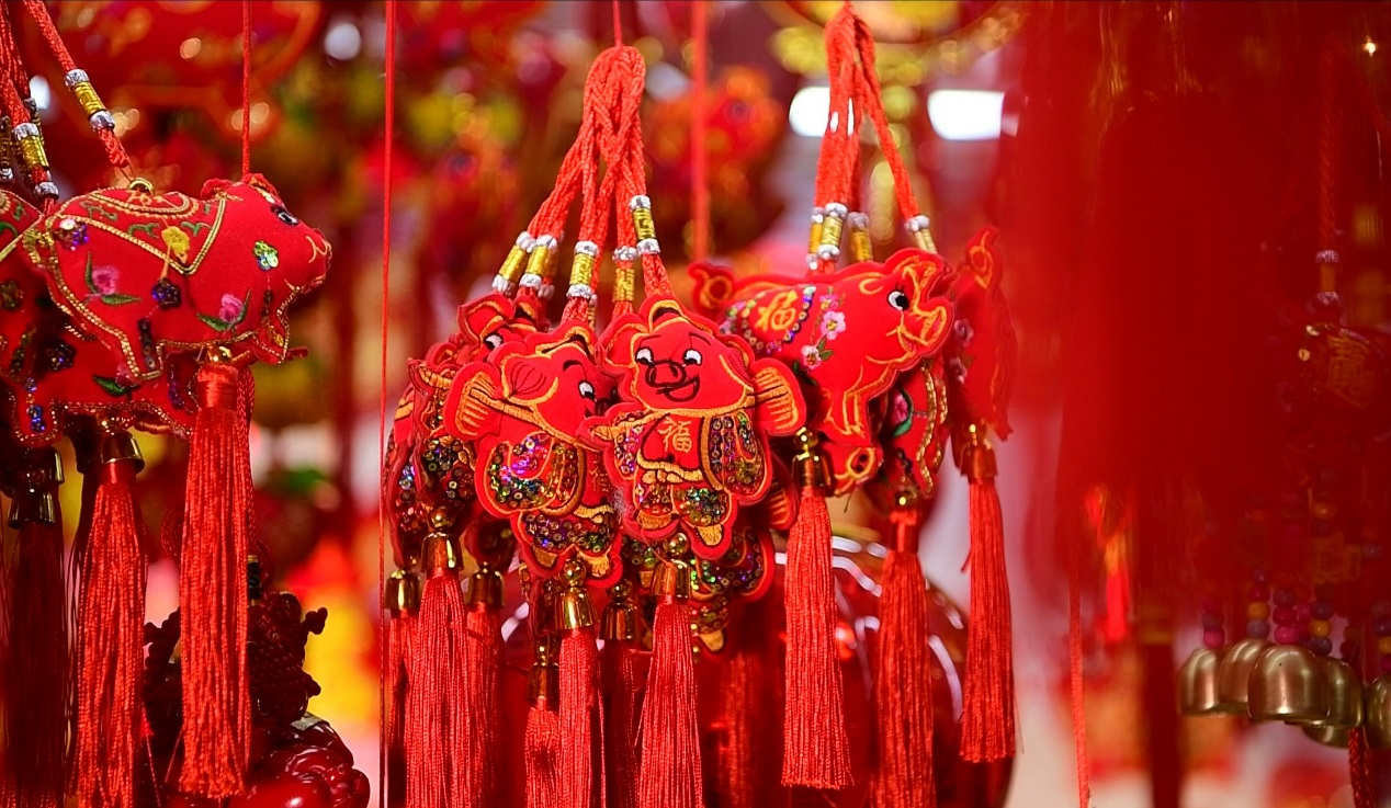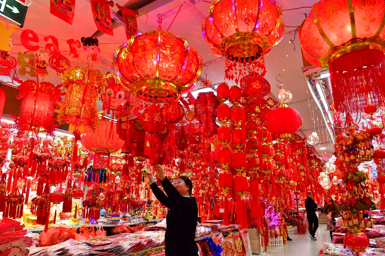 2019年1月18日,南京一商业广场内,众多喜庆装饰品上架销售,一派喜庆氛围。年近了,红灯笼、春联、窗花等各式喜庆装饰品开始热销。其中,“金猪”装饰颇受欢迎。