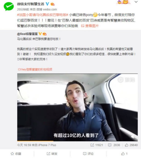 腾讯科技讯 1月24日消息,去年一个法国小哥@Real信誓蛋蛋的视频在微博上刷屏,该法国小哥希望微信支付能去拯救落后的法国。今天他再发微博称,法国现在已能实现微信支付,还表示如果马化腾来巴黎要请他吃饭!