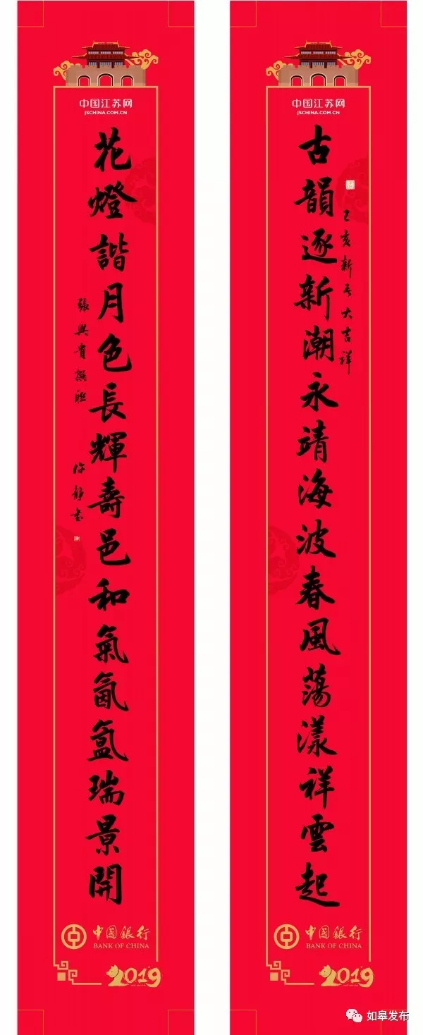日前,由新华报业传媒集团、南通市委宣传部主办,中国银行南通分行特别支持的2019年“城门挂春联 江苏开门红”活动受到全国楹联爱好者的热烈追捧,投稿春联的总数突破万幅,作者遍布全国各个省份及华人圈。这幅春联便是获奖作品之一。