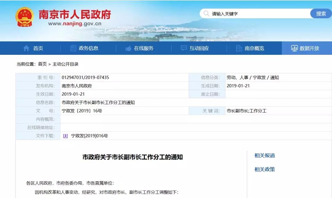 1月24日,南京市人民政府官网公布市政府关于市长副市长工作分工的通知。因机构改革和人事变动,经研究,对市政府市长、副市长工作分工调整如下: