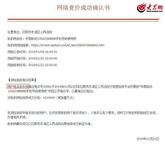 大众网消息,21日上午,在“阿里拍卖·司法”网,东港区人民法院依法对中国移动手机号码“13562388888”的使用权进行拍卖。最终,在当天上午10时12分8秒,“硬核买主”李先生,以最高应价21万(贰拾壹万元)胜出,成为这个手机号的新主人。