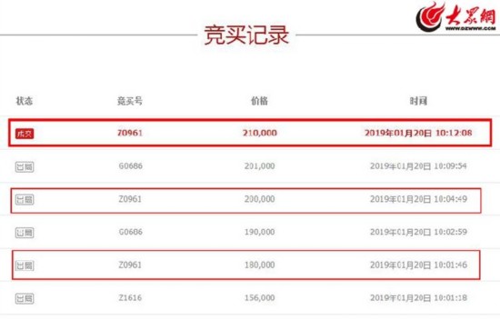那么“硬核买主”李先生,到底是何方神圣?记者不得而知。但从竞拍记录来看,李先生对这个手机号是志在必得,他通过竞买号Z0961三次出价,每次出价都十分豪爽。竞拍从21日10点开始,他10:01:46便给出18万高价,10:04:49再次出价20万。期间,也有卖主给出19万和20.1万的价格,但经过12分钟的激烈竞拍,李先生以21万最高应价胜出。