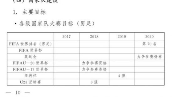 其中2018年的目标,分别是力争获得U20世界杯和U17世界杯的参赛资格,U23亚洲杯要进入到八强。但国青却在亚青赛上,相继以0-1不敌塔吉克斯坦、0-1不敌沙特,末轮在荣誉战上以2-0战胜马来西亚,1胜2负的战绩在小组赛便遭到淘汰。国少甚至未能通过预选赛,无缘亚少赛正赛,更别说冲击U17世界杯的入场券了。