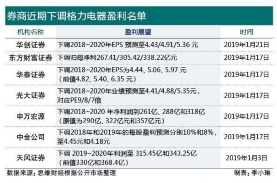 申万宏源在1月17日发布的对格力电器业绩点评表示,考虑到国内商品房销售持续低迷,明后年空调销售压力较大,下调2018-2020年净利润到 261 亿、288 亿和 318 亿(原值为 290 亿、 322亿元和 357 亿元),分别同比增长 16.3%、10.4%和 10.6%,对应每股盈利为 4.33 元、4.78元和 5.29 元(前值为 4.82 元、5.29 元和 5.81 元),对应动态市盈率分别为 9倍、8倍和7倍。