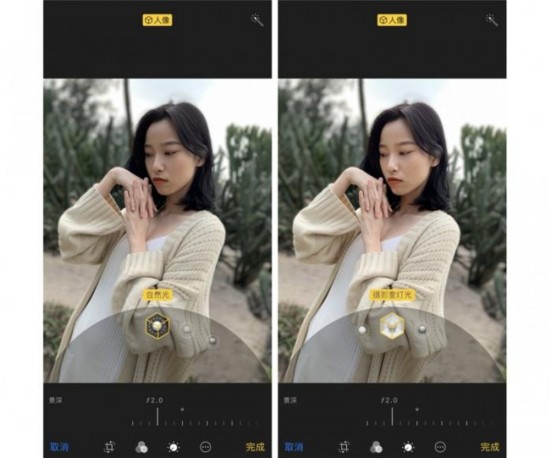 2. 使用 iPhone XR 的人像模式拍摄时,保持好与拍摄对象合适的距离在 1 米以内,此时才能激活人像功能,并拍出背景虚化的人像。推荐使用“摄影室灯光”光效,可以提升人物的面部气色。光效和光圈虚化的强弱在拍摄前后都可以进行自由地调整。