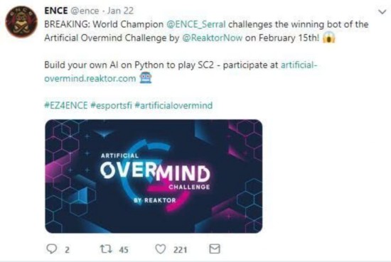 而在1月22日,芬兰电竞战队ENCE在微博网站Twitter上披露重大消息:WCS《星际争霸2》全球总冠军、人称大魔王的芬兰选手Serral,将在2月15日与AlphaStar上演一场终极人机大战。
