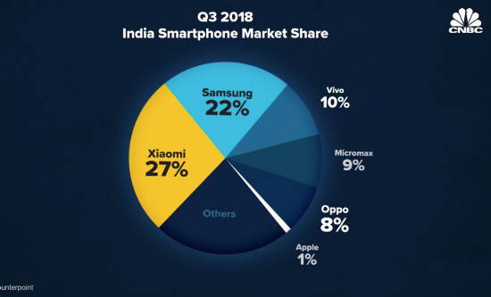 根据研究公司Counterpoint的数据,在2018年第三季,三星和小米度在印度的智能手机销量,分别占整体市场的市场的22%和27%,几乎是占据了半数的市场份额。