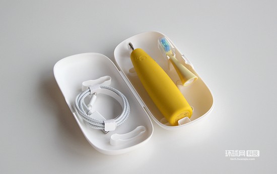 首先,我们先来看看此产品的外观。打开包装,包装内包括了牙刷手柄,超软刷头,标准刷头,便携牙刷盒,充电底座与充电线。