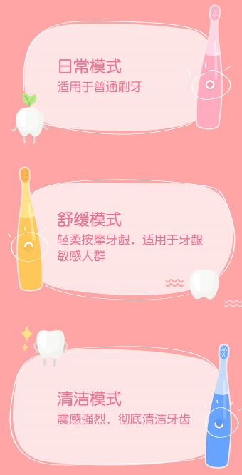 大犀儿童智能声波电动牙刷共有三种模式,三种强度可供选择。符合各类人群各种各样的需求。