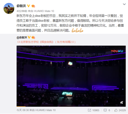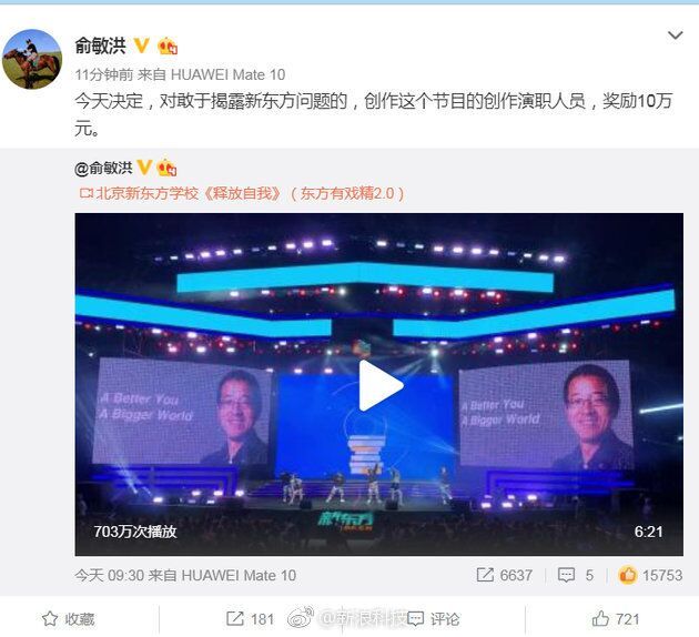 25日下午,俞敏洪微博表示,“对敢于揭露新东方问题的,创作这个节目的创作演职人员,奖励10万元”,但不久后便被删除,只留下上午发的节目视频。