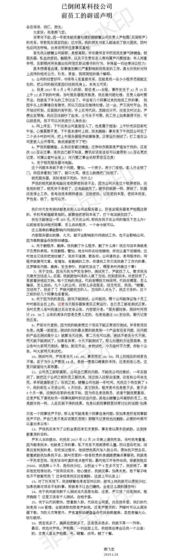 1 月 24 日,燕某发表长文针对深圳市螃蟹网络科技有限公司创始人尹某的《告游戏行业全体同仁书》中提及的各项指责以及网络传言一一反驳,并表示一切法庭上见,相信法律会还一个公道,具体反驳如下:(文末附燕某本人回应长文截图)