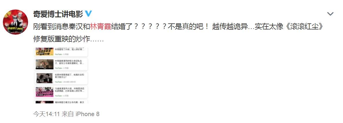有网友认为,可能是因为由林青霞、秦汉主演的电影《滚滚红尘》将在3月8号重新上映,现在才会出现两人结婚的谣言,只是要进行炒作。