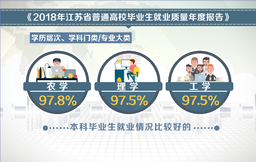 本科毕业生就业情况比较好的是:农学97.8%、理学97.5%、工学97.5%;