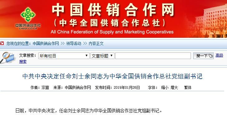 日前,中共中央决定,任命刘士余同志为中华全国供销合作总社党组副书记。