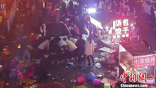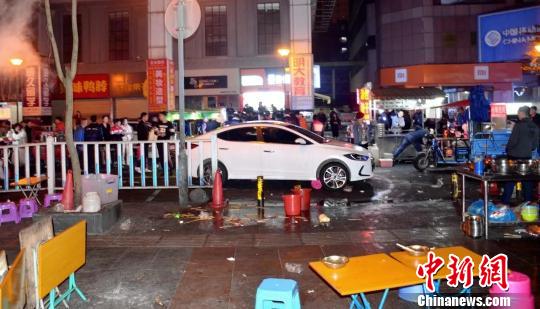 事发前,涉事小轿车停靠在路旁。车辆启动后准备左转驶离后,突然朝前猛冲,撞向前方宵夜摊的餐桌。多名正在就餐的食客被撞倒,一名男子被卡在车下,桌子板凳四散零落。周边群众急忙跳开躲避,拍打车辆企图让它停下。但车辆驾驶人仍继续倒车、前进,直至车门被现场群众打开,将男子拉下车。