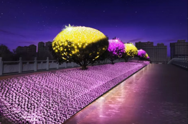 同时,园区内还安装有各色各样的LED灯带,满天星渔网灯及体现丰县特色的景观造型亮化灯组。