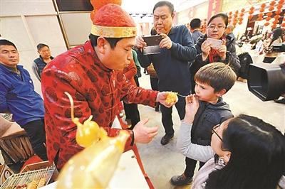 北京青年报记者在现场看到,扎灯笼、毛猴、盘扣等非遗文化项目都出现在了现场,还有民间艺人展示风筝、剪纸、风车及捏面人、吹糖人、制作糖葫芦等,民乐展示体验,书法老师写春联,包饺子、逛庙会,参观各国文化展览展示、进行各国文化问答……
